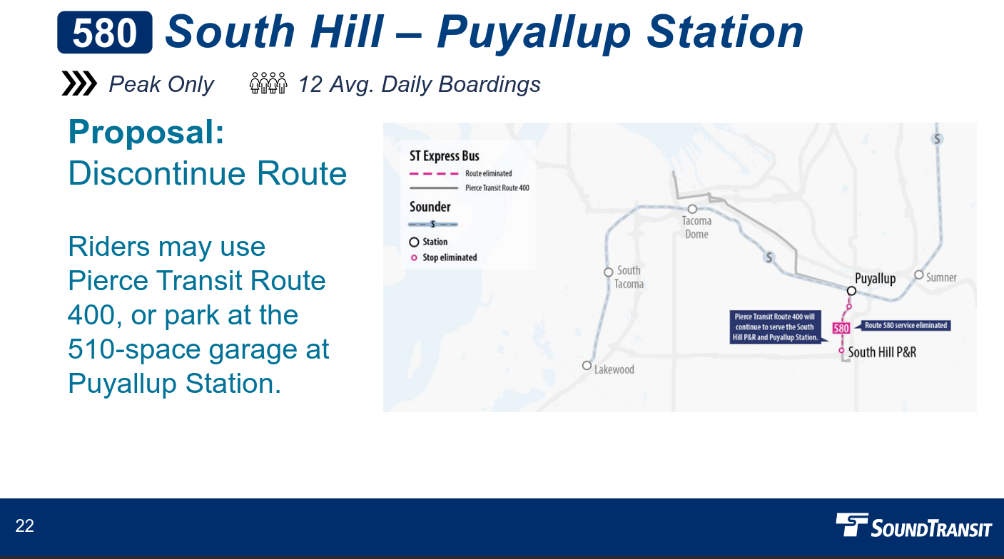 - Route 580 (South Hill to Downtown Puyallup) eliminated