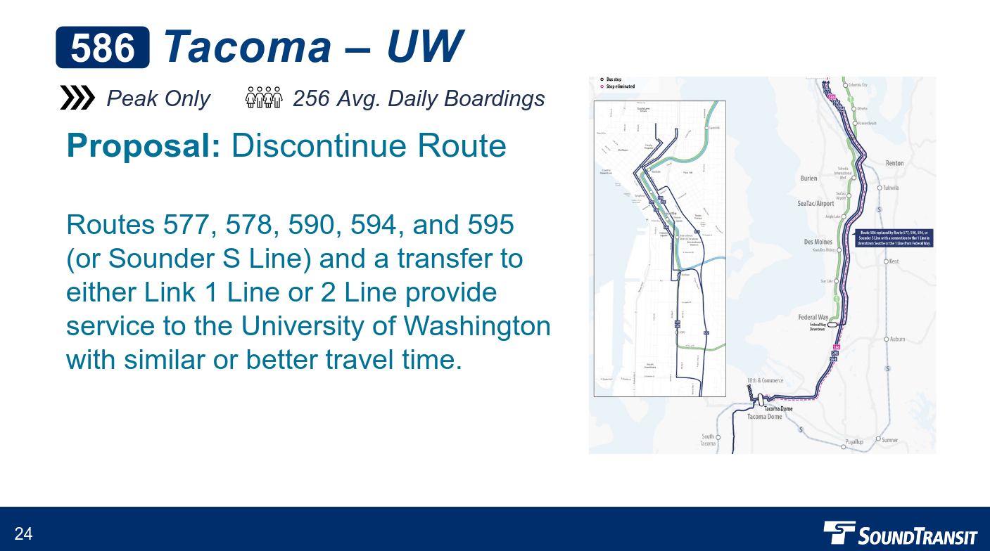 Route 586 between Downtown Tacoma and UW has been considered for elimination since light rail was extended to the University of Washington back in 2016. This long haul route now duplicates not only 1 Line light rail between Federal Way and Lynnwood, but also after the 2 Line extends across Lake Washington to link Bellevue and Seattle, service between Downtown Seattle and UW will come down to a world-class four minute headway. This means that taking a regular Tacoma-Seattle Express on Routes 590 and 594 and transferring to light rail may save time under peak traffic conditions, which is when Route 586 operates. This also uses excess passenger capacity on Route 590 and 594 more effectively, supporting long-desired plans to for frequent service between Tacoma and Seattle.
