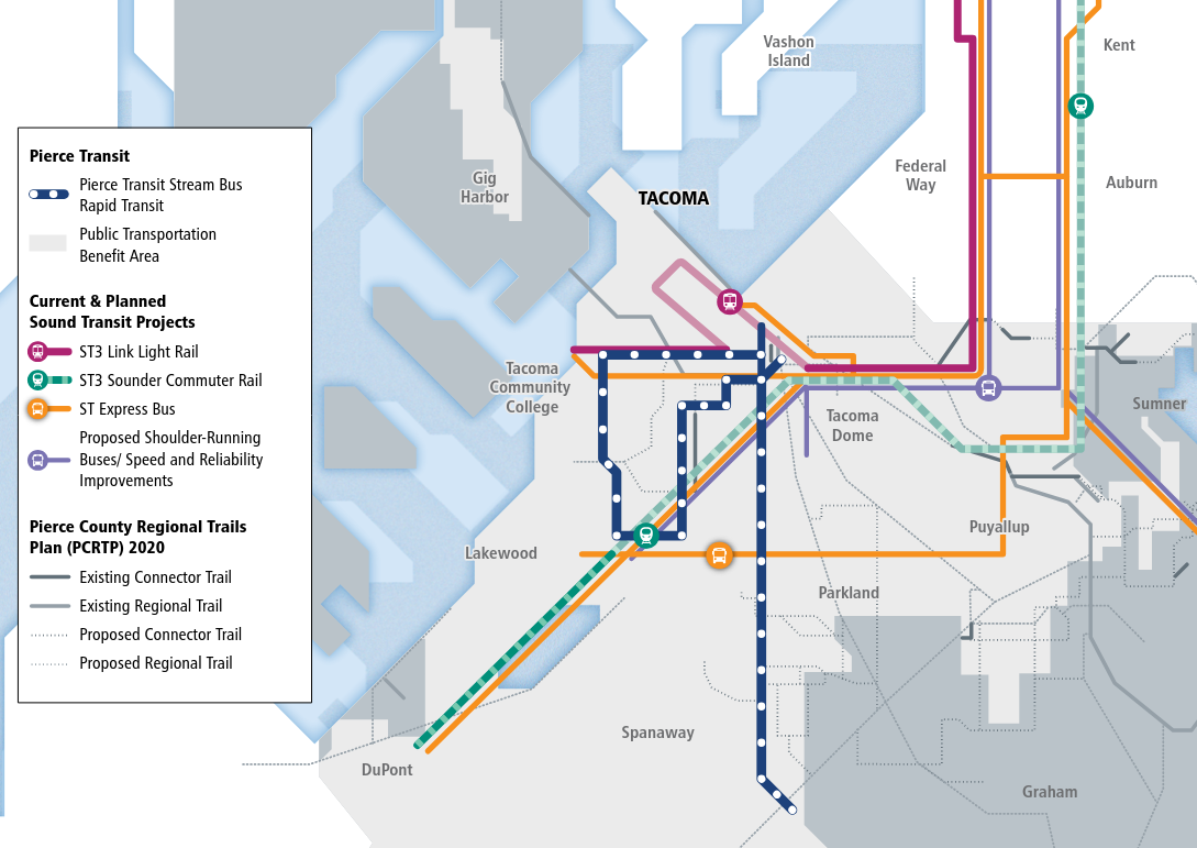 This could be a long term partnership with Pierce Transit and a stopgap between now and when light rail opens at Tacoma Dome in 2035. If service on Pierce Transit Routes 2 and 3 for instance could include a reroute to Tacoma Dome Station and then express legs to Federal Way, it could create a two-seat ride experience to the airport with more passengers starting as pedestrians from their front doors. This is liable to scale greater over time as Routes 2 (19th Street) and 3 (South Tacoma Way) are candidates for conversion to bus rapid transit. This type of partnership with Pierce and Sound Transit is not unknown, it is somewhat how things work with Sound Transit Route 595, which serves Gig Harbor, TCC, and Downtown Seattle. Pierce Transit in this instance funds the extension to Gig Harbor, which is outside the Sound Transit District.